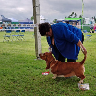 2 Parke’s Bessalin Red Hot Chillie. I liked this dog for his breed type, substance and balance. It was hard to assess movement as it was untidy but when I could see it, he was sound coming and going. A houndy head with correct head planes and typical expression. Good shoulders, excellent chest, ribbing carried well back, good bend of stifle, well knuckled feet. Level top line. He had a little more ground clearance than 1.